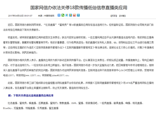 原标题:国家网信办依法关停18款传播低俗信息直播类应用