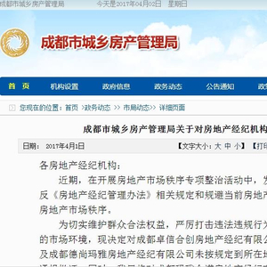 据介绍,近期成都市房管局在开展房地产市场秩序专项整治活动中,发现部分房地产经纪机构存在违反《房地产经纪管理办法》相关规定和规避当前房地产市场调控政策等行为,严重扰乱房地产市场秩序。