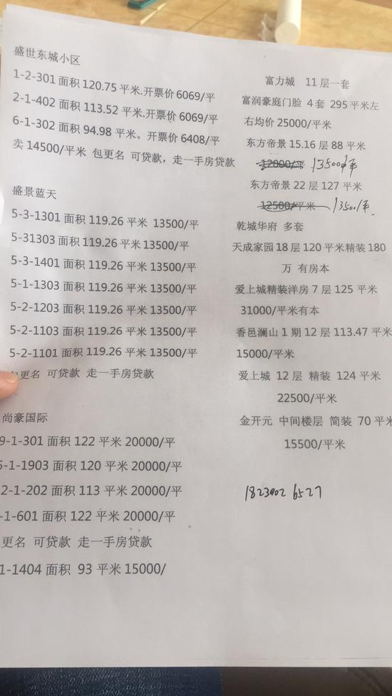 在另外一家中介机构,一个从福建赶过来的购房者刚刚全款买下一套二手房。记者拿到其正在代理的房源价格表。价格表分为两栏,置业经理声称左面部分房源可办理贷款,“业主还没办理贷款手续,现在转让,所以可以走一手房贷款手续”,记者发现,表上列明的盛世东城小区的开票价是每平方米6069元,现在售14500元/平方米。右边部分的房源为现房,则不能代理银行贷款。其中,东方帝景的两套房源标注的价格是12000元/平方米,置业经理看到后拿起笔将价格改成了13500元/平方米,“不好意思,这是今天早上8点打印的价格,现在业主已经要求涨价了”。设立雄安新区消息公布的前几天,白沟的房价只有6000元/平方米左右,两会期间甚至只有3000元~4000元/平方米。