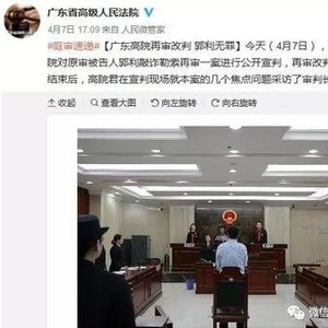 ▲4月7日,广东省高级人民法院对原审被告人郭利敲诈勒索再审一案进行公开宣判,再审改判郭利无罪。 广东省高级人民法院官方微博截图