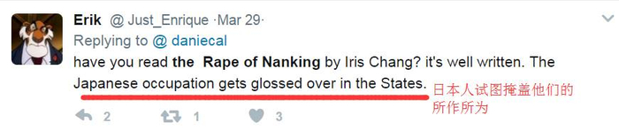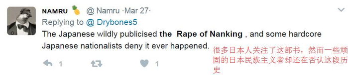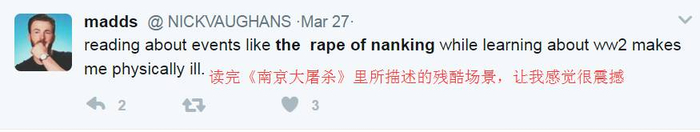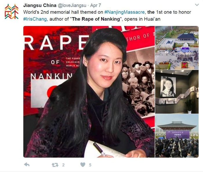 然而理性的人们却并没有被蒙上双眼,4月7日,中国南京在其官方Twitter上发布了张纯如纪念馆落成的消息,令许多国外的网友,开始重新关注南京大屠杀,关注这段不可被否认的历史。
