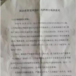 该举报信还称,在加强党风廉政建设,严格执行中央“八项规定”的今天,却发生这样的大吃大喝而且喝死人的大事,希望上汽集团和上依红公司能给社会公众一个合理合法的解释,也希望媒体能介入调查,督促相关部门对相关负责人予以严处。
