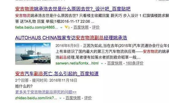 转眼间,一个多月过去了,记者几乎都快忘了举报信一事。3月底,一个偶然的机会,记者在网上看到了两条关于举报信中提及的安吉物流副总姚某浩猝死的信息,时间为2016年11月17和18日。但除此之外,便无更多有效信息。
