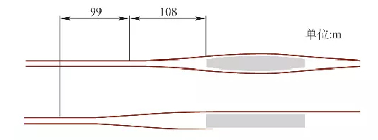 鱼腹形岛式站台在车站中部设置一组曲线,车站端部呈楔形,整个站台中间宽、两头窄,从而可有效缩短区间喇叭口过渡段的长度。鱼腹形与普通矩形岛式站台区间喇叭口过渡段比较示意见图1,矩形站台宽度为10m,鱼腹形站台中部宽度为10.5 m,线路曲线半径R = 1000m }。可以看出,鱼腹形站台区间喇叭口过渡段长度约为矩形站台的1 /2,缩短99 m,大幅度减少了区间用地切割。