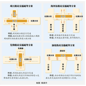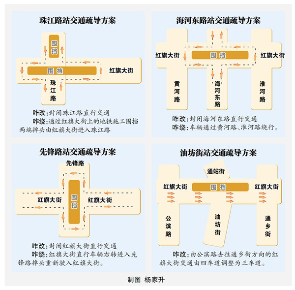 具体情况:红旗大街方向交通保持不变,封闭珠江路直行交通,珠江路直行车辆通过红旗大街上的地铁施工围挡两端掉头后,由红旗大街右转进入珠江路。