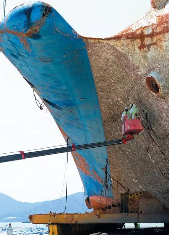 ▲ 12日下午,现场清理本部工作人员在全南木浦新港乘坐起重机正在检查船体外观。