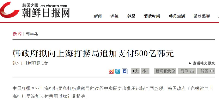 《朝鲜日报》援引政府高层人士的消息说,海洋水产部决定弥补上海打捞局的部分损失,追加支付规模预计在300亿至400亿韩元,上限不超过500亿韩元。