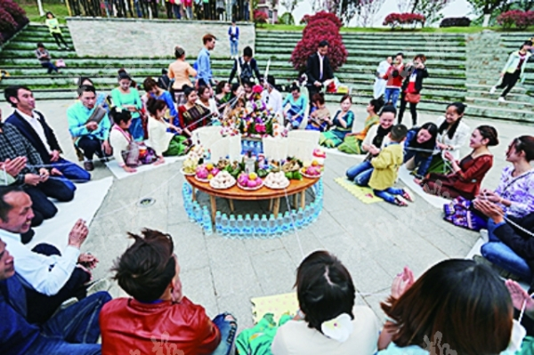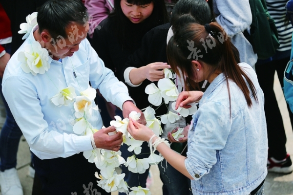 上午10点,风情别样的民俗展示上演。没有香料,学生们用多种香水混合代替滴入圣水见人均沾;一根根白线绳绑上“老挝基普”(老挝纸币)系上手腕,双手合十、诚恳祝福;染制的老挝国花鸡蛋花不分男女,低眉戴顶;有趣的留学生还穿戴齐整扮起了新郎新娘……