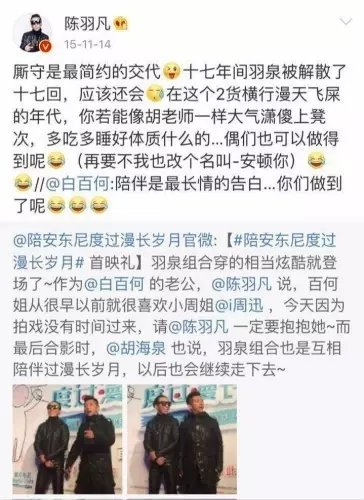 不过,即便是白百何与陈羽凡早已协议离婚,但离婚后两人形诸于外的关系却一如既往。在白百何的微博上,对陈羽凡依然一口一个“老公”,特别是在《跨界歌王》的那段日子。有些粉丝为此感到不解,乃至不忿,协议离婚了还各种秀恩爱,简直是欺骗吃瓜群众的玻璃心。