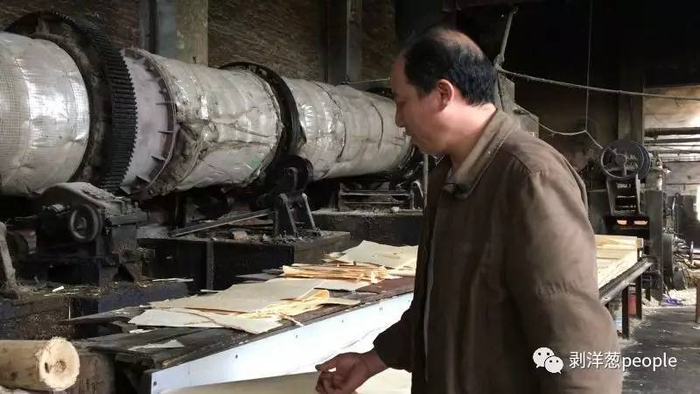 把一根根圆木头削切成一捆捆薄木片。陈正军 摄