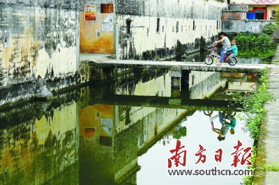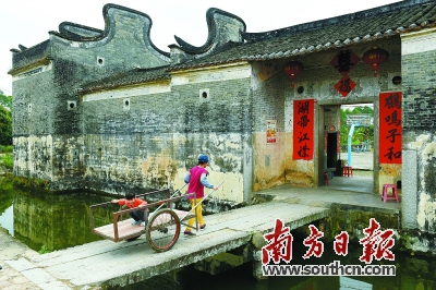 村民通过石板桥进入围楼。