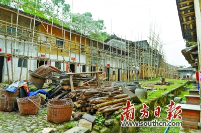 围楼在修缮中。