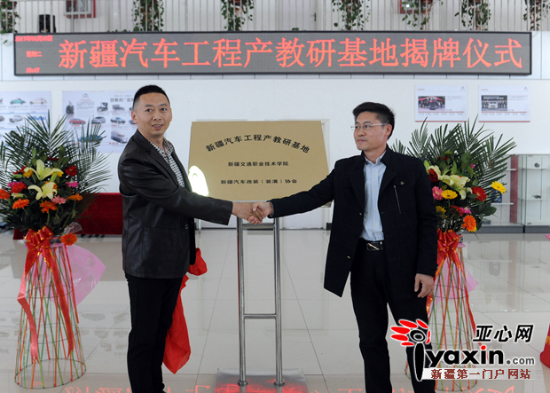 新疆汽车改装(装潢)协会会长王荣焕(左)和新疆交通职业技术学院党委副书记、院长段明社(右)为汽车工程产教研基地揭牌。