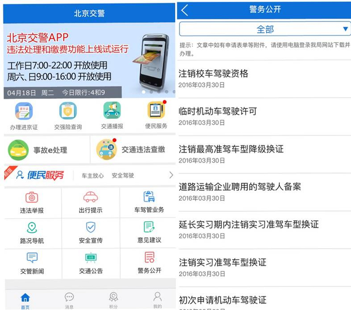 这是北京公安局推出的“北京交警”APP截图,用户可在首页方便查询业务办理情况以及警务公开信息。