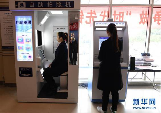 2017年3月8日,市民在重庆两江新区人和派出所使用身份证自助拍照机和自助申领机。 重庆市两江新区公安分局推出的这项“互联网+”便民措施可全天候24小时办理身份证到期换领、丢失补领等业务,全程仅需约3分钟。新华社记者王全超摄