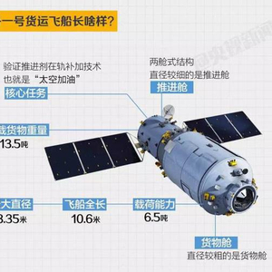 作为我国第一艘货运飞船,也是我国目前为止体积最大、重量最重的航天器,天舟一号货运飞船成功入轨后,将与在轨运行的天宫二号先后进行3次交会对接、3次推进剂在轨补加以及空间应用和航天技术等多领域的实验项目。