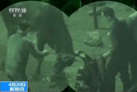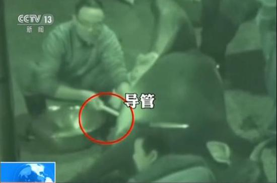几分钟之后,这头牛显得安静了不少,随后上演残忍一幕,让现场调查员触目惊心。几分钟之后,一个戴眼镜的男子,在牛肚子上割开了一个小口子,随后拿来一根导管刺入牛肚子进行放血。