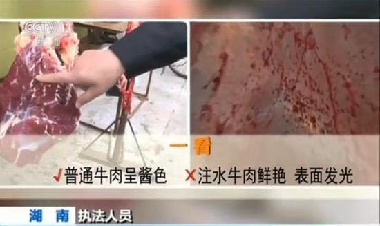 执法人员:从颜色上看,正常的牛肉,它是酱色。打了水的牛肉的话,它第一个颜色比较鲜艳,表面发光。用餐巾纸粘在牛肉的表面,它如果打了水的话,餐巾纸就一下子湿掉了。(央视记者 李彤辉 虞纵横 黄黎明)