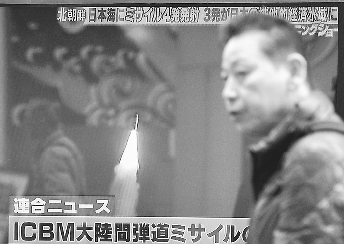 日本东京街边大屏幕播放朝鲜发射导弹的新闻。