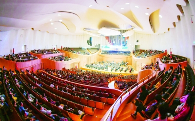 虽然调试演出只有1个小时时间,音乐厅的首演还是让观众惊艳。记者看到,音乐厅顶面流线型的浮雕天花板延续了大剧院的整体设计风格,舞台四周的墙壁表面也设计成轻微凹凸的效果。现场工作人员介绍:“顶部的流线型浮雕不只是装饰,更重要的作用是利用特定的线条纹路将声音扩散至音乐厅的每个角落,而墙壁的声学扩散墙也是为了把声音均匀扩散至剧场空间。对于音乐演奏的空间,需要混响使乐曲更加舒缓愉悦,音乐厅比较理想的混响时间为1.8—2.2秒。接下来我们通过细节调试力争达到2.2秒混响的优质音效。”