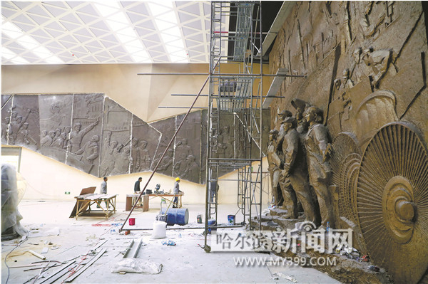 设计人员告诉记者,主浮雕是整个展馆的主形象,雕塑采用半写意的艺术方式进行创作,充分地展示了展厅的内涵。大厅两侧的浮雕以长篇浮雕画卷的形式展示了哈尔滨城市工人运动史的发展脉络,与主浮雕相互呼应,使得整个大厅具有厚重的历史感与浓重的艺术氛围。
