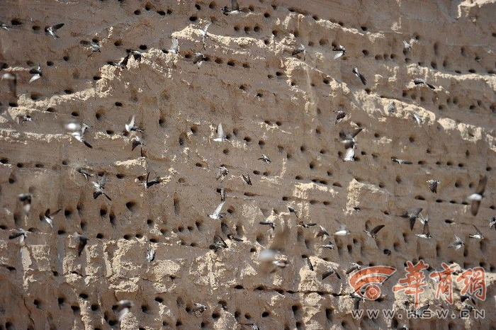 在渭河北岸,马家湾米家崖附近的一处工地里,来了一群燕子,它们在工地施工中产生的一处沙土崖壁上筑起了巢。放眼望去,20米长,10米高的崖壁上密密麻麻被燕子凿出了拳头大小的洞穴,筑成了它们的巢穴。