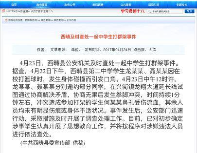 4月24日晚,上游新闻记者从西畴政务网获悉,云南省西畴县县委宣传部通报,23日,该县公安机关及时查处一起中学生打群架事件。