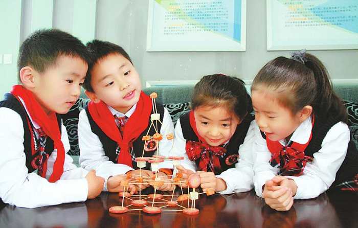 成都市双林小学科技馆内学生在观察萝卜牙签塔。(李燕 摄)