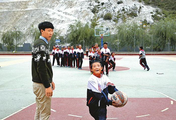 稻城县城关小学学生在老师指导下练习投篮。(刘磊 摄)