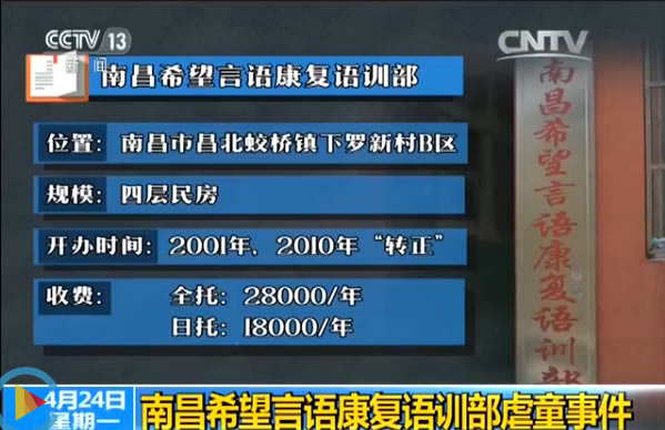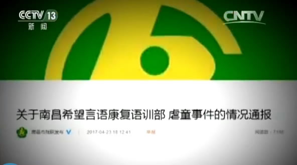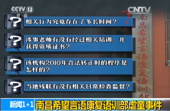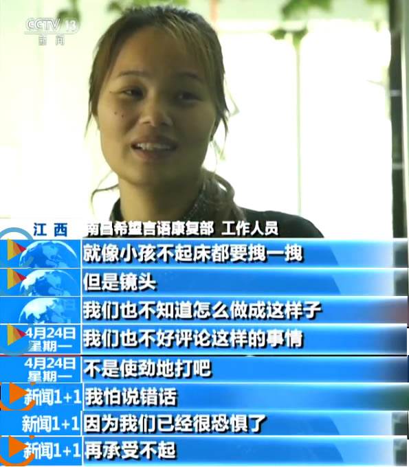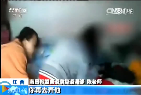 央视网消息(新闻1+1):打头、扇耳光、用脚踹,他们是聋哑儿童,父母花钱是让孩子们进行语言康复训练的。这到底是一家什么样的聋哑儿童语言康复机构?停业整顿、进行调查。《新闻1+1》今日关注:南昌希望言语康复语训中心“虐童事件”。