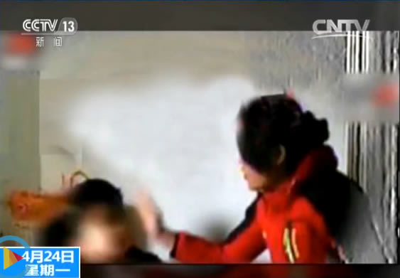 第二张,是一名老师在使劲摇晃孩子,因为我们截取的是一个固定画面,视频中这个摇晃的动作很激烈。