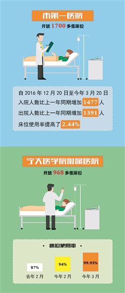 2016年11月,市第一医院出入院管理中心试运行,目前,除了产科、ICU等科室,全院1700多张开放床位统一由出入院管理中心统筹安排。据统计,2016年12月20日至2017年3月20日,该院入院人数比上一年同期增加1477人,出院人数比上一年同期增加1391人,床位使用率提高了2.44%。宁大医学院附属医院也是如此。该院入院准备中心主任宋晓平说,自启用入院准备中心以来,床位使用率大大提高。该院实际开放床位968张,2016年2月床位的使用率在87%,2017年2月提高至94%,3月份更是提高到了99.93%。床位使用率提高,直接得益的是病人。乐凌说,对于择期手术的病人,现在一般三四天内能顺利入院。“住院通知有人管,患者住院有人带,闲置床位有人调”。