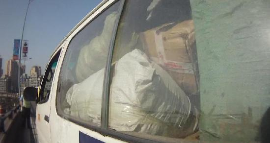 4月24日上午,江北区公安分局观音桥大队在华新街路段执勤,一辆车身破旧的面包车驶来,透过车窗看见车内装满了大大小小麻袋和货物。