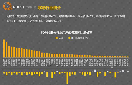 在移动视频行业里主要关注两个点,即时通讯以及在线视频,依旧是目前移动端行业里用户最大的两个领域。在同比增长上,游戏、短视频、外卖增速最快,秒拍在短视频里,处于高速成长前列。同时,这里存在一个有趣的现象——即时战略增长率(王者荣耀)162%,而游戏助手却处在下降状态。