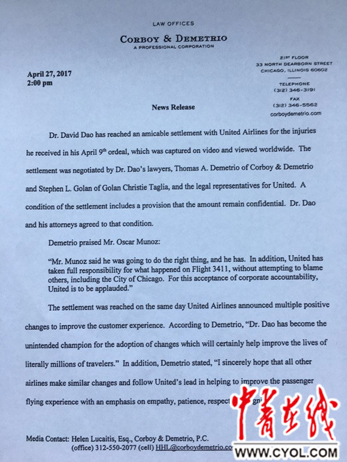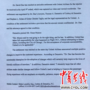 中青在线北京4月28日电(实习生林晓茜 中国青年报·中青在线记者陈小茹)美国当地时间4月27日,被暴力拖拽下机的美籍越南裔医生陶大卫与肇事的美国联合航空公司(下称“美联航”)达成庭外和解协议。作为协议条件之一,和解协议的具体内容和最终赔偿金额并未对外公开,陶大卫和他的代理律师已经接受了和解协议。