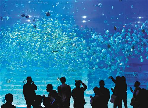 4月27日,重庆汉海海洋公园开门迎客,游客举起手机拍摄漂亮的鱼群。