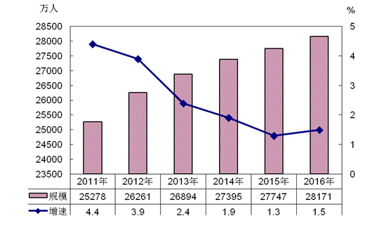 2016年农民工总量达到28171万人,比上年增加424万人,增长1.5%,增速比上年加快0.2个百分点。其中,本地农民工11237万人,比上年增加374万人,增长3.4%,增速比上年加快0.7个百分点;外出农民工16934万人,比上年增加50万人,增长0.3%,增速较上年回落0.1个百分点。本地农民工增量占新增农民工的88.2%。在外出农民工中,进城农民工13585万人,比上年减少157万人,下降1.1%。