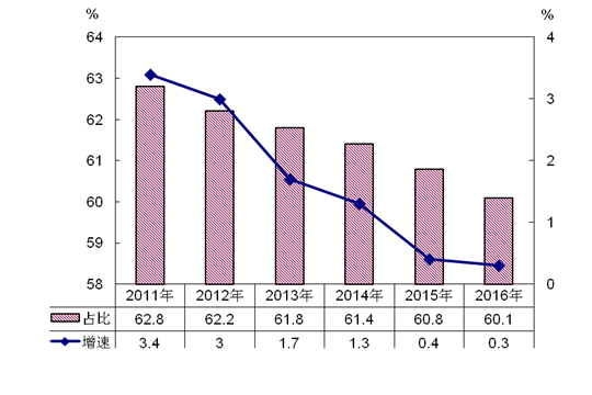 2011-2016年,外出农民工增速呈逐年回落趋势,增速分别为3.4%、3%、1.7%、1.3%、0.4%和0.3%。外出农民工占农民工总量的比重也由2011年的62.8%逐渐下降到2016年的60.1%。
