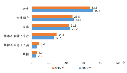 在城市生活中,除家人外,进城农民工业余时间人际交往时,老乡占35.2%,比上年提高1.6个百分点;当地朋友占24.3%,比上年提高0.8个百分点;同事占22.2%,比上年提高0.7个百分点;其他外来务工人员占3.1%,比上年下降1.1个百分点;基本不和他人来往占12.7%,比上年下降1.6个百分点。