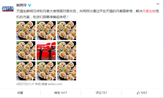 27日,@新周刊发博文表示,天猫生鲜28日将和丹麦大使馆面对面交流,共同探讨通过开在天猫的丹麦国家馆,解决丹麦生蚝危机的方案。此外,还在句末提醒大家“吃货们蒜蓉准备起来吧!”
