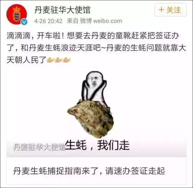 也许是看到自己的求助微博受到广大中国网民的关注,26日,丹麦大使馆官微再次发声,“滴滴滴,开车啦!想要去丹麦的童靴赶紧把签证办了,和丹麦生蚝浪迹天涯吧~丹麦的生蚝问题就靠大天朝人民了。”