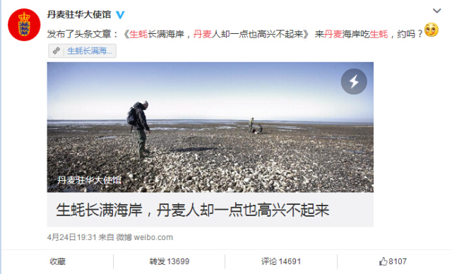 4月24日,丹麦大使馆官方微博账号“丹麦驻华大使馆”发布一篇名为《生蚝长满海岸,丹麦人却一点也高兴不起来》的求助文章称,丹麦被太平洋生蚝这一新物种入侵,它们在丹麦没有天敌,肆意疯长,对海岸的生态环境造成极大破坏,科学家和渔民都束手无策。