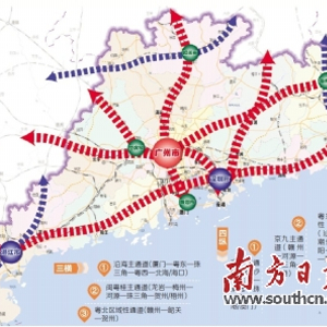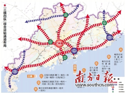 为构建功能完善的综合交通网络,广东将按照“三横四纵”的综合运输通道布局,统筹不同层面运输需求,进一步完善综合交通运输网络功能结构,提升网络整体利用效率。“三横”是指沿海主通道(厦门—粤东—珠三角—粤西—北海/海口)、闽粤桂主通道(龙岩—梅州—河源—珠三角—贺州/梧州)、粤北区域性通道(赣州—韶关—贺州)。“四纵”是指京广主通道(长沙—韶关—清远—珠三角—香港/澳门)、京九主通道(赣州—河源—珠三角—香港)、粤东区域性通道(汕头—潮州—揭阳—梅州—瑞金)、粤西区域性通道(湛江—茂名—广西)。