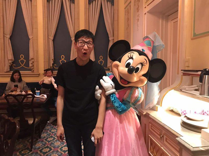 入住上海迪斯尼期间,晚餐时和卡通形象合影。