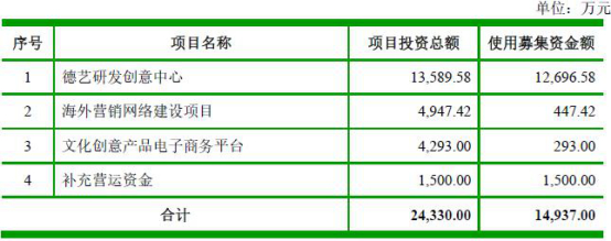 公司本次募集资金净额14,937万元用于德艺研发创意中心、海外营销网络建设项目、文化创意产品电子商务平台、补充营运资金。