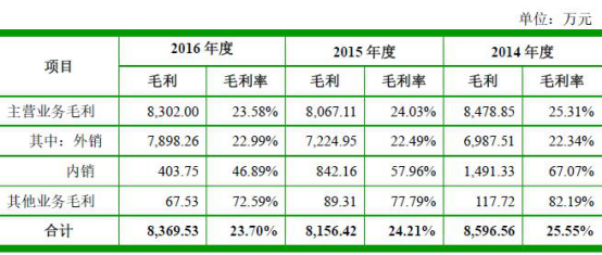 招股书显示,2014年-2016年,公司毛利率分别为25.55%、24.21%、23.70%。公司营业毛利分别为8,596.56万元、8,156.42万元和8,369.53万元,主营业务毛利分别为8,478.85万元、8,067.11万元和8,302.00万元,占营业毛利比重分别为98.63%、98.91%和99.19%,公司主营业务突出。