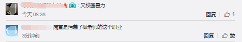 记者了解到,不少网友对该校园暴力事件表示不认同与指责,认为教师应以正确态度对待学生,而视频中涉事教师的这种含有暴力意味的行为会给学生带来消极的心理影响。