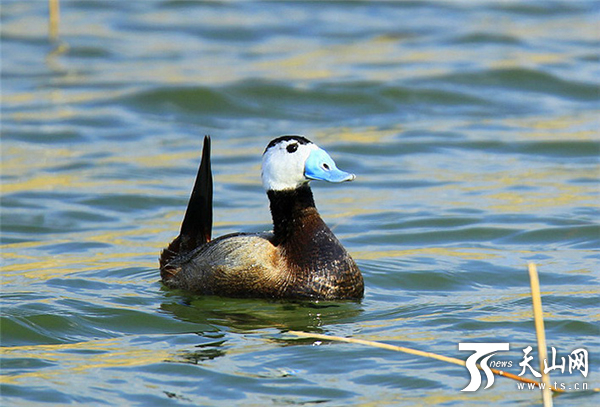 白头硬尾鸭正在水中嬉戏,图片来源:荒野新疆、老虎印象。