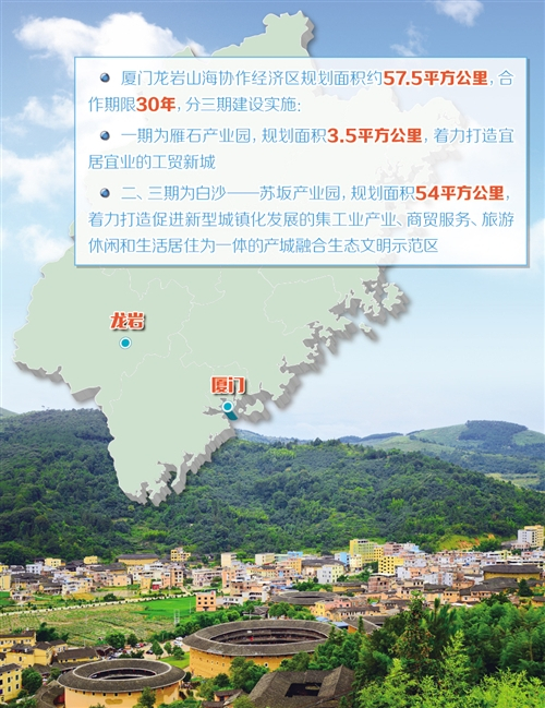 2014年5月份,厦门龙岩山海协作经济区获福建省政府批复成立,成为福建省惟一的市际合作经济区,也是全国惟一同时享受特区和苏区叠加政策的经济区。合作区规划面积约57.5平方公里,合作期限30年,分三期建设实施:一期为雁石产业园,规划面积3.5平方公里,着力打造宜居宜业的工贸新城;二、三期为白沙——苏坂产业园,规划面积54平方公里,着力打造促进新型城镇化发展集工业产业、商贸服务、旅游休闲和生活居住为一体的产城融合生态文明示范区。