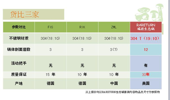 “美国Regal Ware工厂的质保是永远,在国内我们承诺30年。”针对一口RARETURN(瑞抟)锅具数千元的昂贵价格,王悦算了一笔账:使用30年能保持如新,能减少2/3以上的烹饪时间和能源,减少20%的包装空间材料,每年节省12桶5升花生油,家里不再需要装抽油烟机,甚至不需要有专用厨房(在中国一二线城市,随便一个厨房的总投资包括房产在内动辄几十万到几百万元),饭店不再需要高级厨师,更重要的是,健康无价。